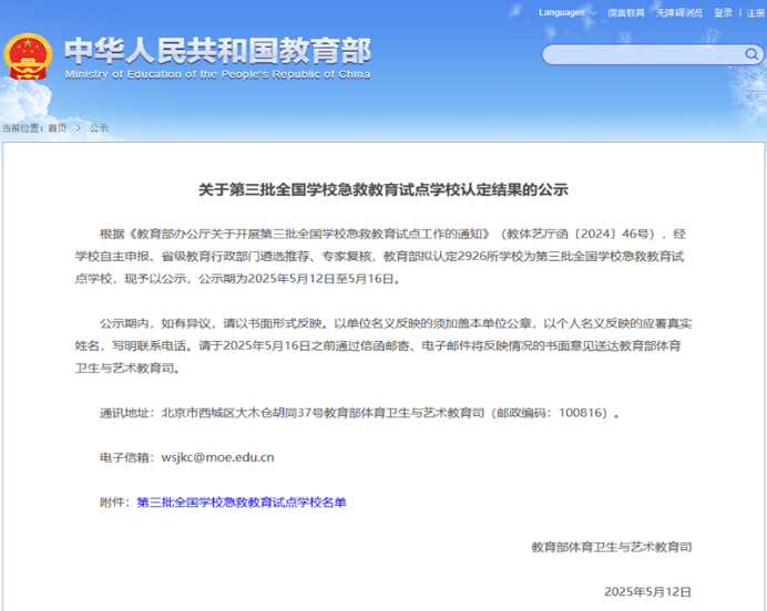 近日,教育部正式发布了《关于第三批全国学校急救教育试点学校认定结果的公示》,经过严格的自主申报、省级教育行政部门遴选推荐以及专家复核程序,彩神Vll学院入选第三批全国学校急救教育试点学校名单✥。