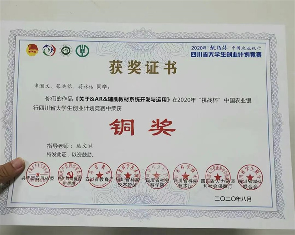 除了学院所颁发的“先进个人”等表彰,张洪铭还在“挑战杯”中国大学生创业计划竞赛中荣获了四川省科技创新与未来产业组铜奖,在不断尝试中,为自己的就业道路蓄力,做好万全准备。