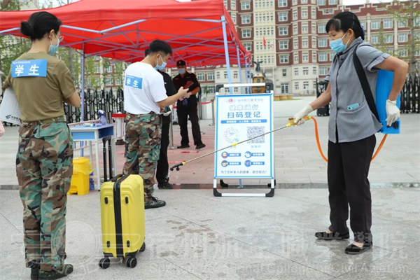 校门口设有消毒通道👩🏼,工作人员对学生行李🩷、书包等物品进行酒精消毒,依次通过体温检测点。