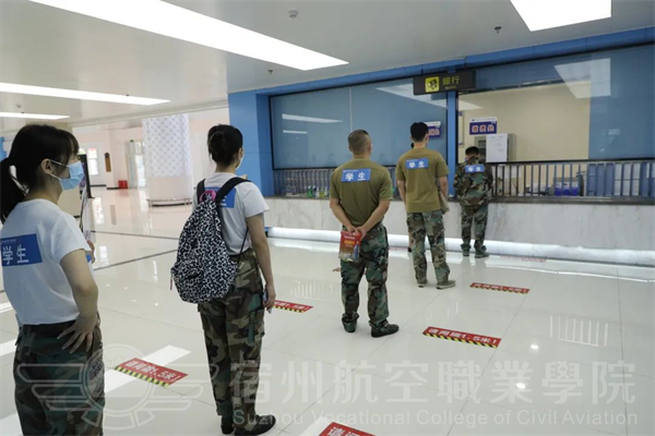 在报到缴费环节,同学们排成一路纵队,按照地面分隔线间隔1.5米,缴费前进行手部消毒。