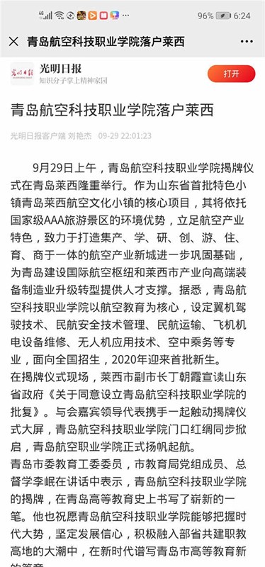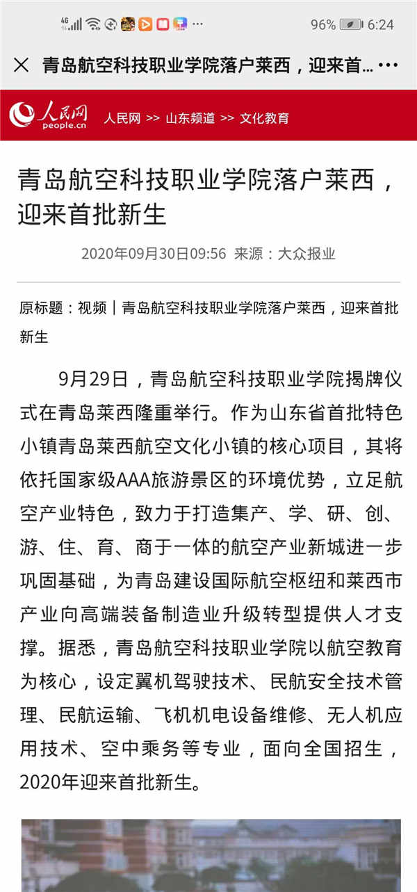 青岛航空科技职业学院以航空教育为核心,设定翼机驾驶技术、民航安全技术管理、民航运输、飞机机电设备维修、无人机应用技术、空中乘务等专业,面向全国招生,2020年已迎来首批新生。