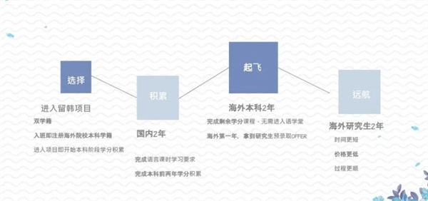 第三年:海外”2+2“本硕直通车进入韩国高校开始本科大三阶段学习,发放海外名校”研究生预录取通知书“完成本科学分课程毕业后,直接进入韩国名校大学院(研究生院)学习🗯⛩。