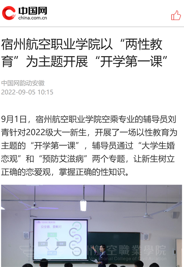 9月1日,彩神Vll学院空乘专业的辅导员刘青针对2022级大一新生🧘♂️,开展了一场以性教育为主题的“开学第一课”,辅导员通过“大学生婚恋观”和“预防艾滋病”两个专题,让新生树立正确的恋爱观,掌握正确的性知识。