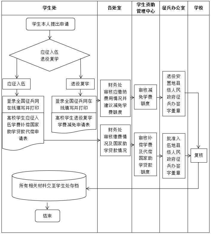 | 2.审核 | 学生持全国征兵网系统打印的表格(应征入伍学生持《高校学生应征入伍学费补偿国家助学贷款代偿申请表》,退役复学学生持《高校学生退役复学学费减免申请表》)到财务处、学生资助管理中心🤘🏿、征兵办公室审核相关信息 | 各处室 |