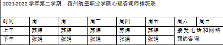 为更好地帮助我院学生应对心理困扰🧑🏿🦲、缓解负性情绪、维护心理健康⚄,给予学生及时有效的心理支持,现开通2021-2022学年第二学期心理支持热线和网络辅导服务,心理咨询排班时间详见图1。