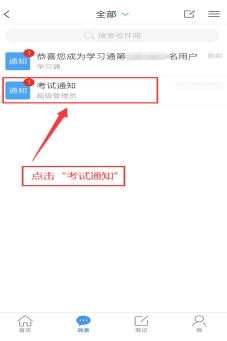 1.点击最下方“消息”⛴,消息栏中选择“收件箱”;查找所报考的对应学校发布“考试通知”,点击进入;