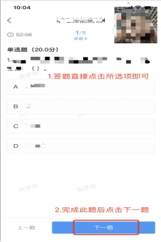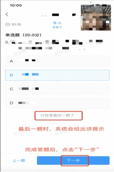 4.开始答题并交卷,每题选择正确答案点击该选项即可,点击右下角“下一题”继续作答;直到最后一题时系统会提示“已经是最后一题了”🗓,可点击“下一步”进行答题情况核查🤦🏼♂️。