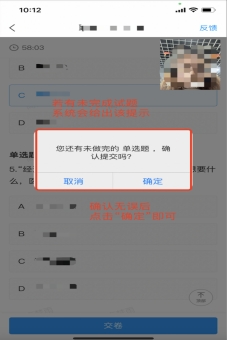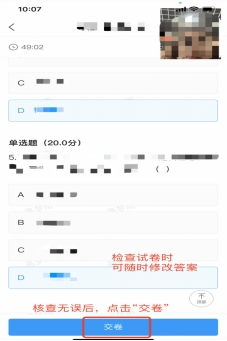 5.核查作答情况时,可修改选择答案;确认无误后⛓,点击最上方的“交卷”按钮🫖,并确认提交🔲。(若存在未作答题目☣️,系统会提示,请注意核查!)