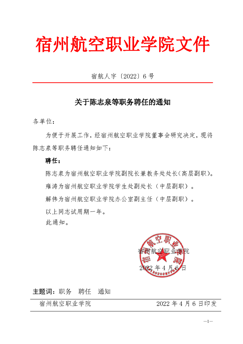 关于陈志泉等职务聘任的通知