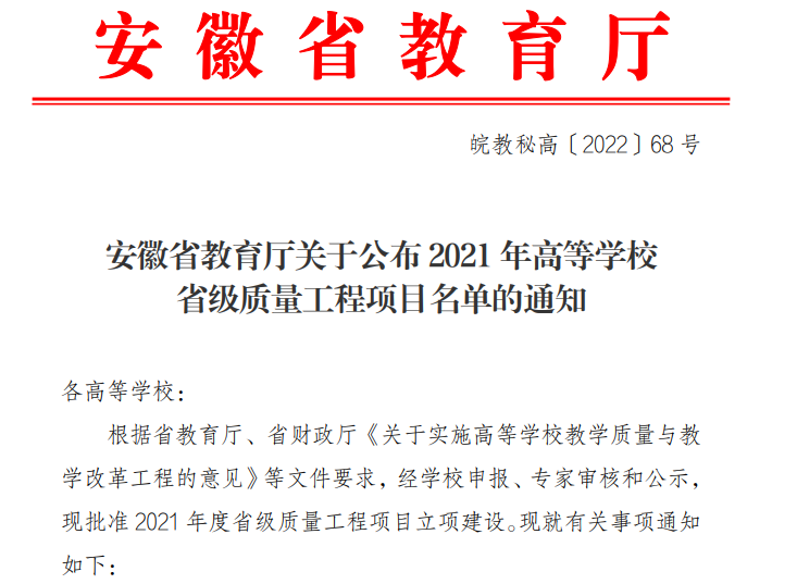 安徽省教育厅公布了2021年高等学校省级质量工程项目立项名单,我校3个项目获批立项建设,其中产教融合实训基地1个,教学研究项目重点1项🧽、一般1项👩👧👧。