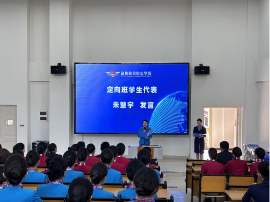 首先由定向班学生代表朱慧宇同学进行发言,感谢学院为学子们提供一个深入了解国际航空产业领域的机会与平台。她表示,作为定向班的一员,将积极参加定向班的技能培训,珍惜本次提升机会,认真对待各项课程🤏🏿,遵守学院各项规章制度及要求🤳🏼,同时也规划好自身未来,做好就业准备,争取早日成为航空产业的中坚力量🧔♀️。