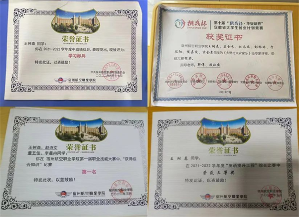 回望在宿航求学道路上的种种,脚踏实地的坚守和努力代表的是不留遗憾👰🏼、不被辜负。时间和精力的付出,让王树森得到了丰盛的回报:荣获2022年国家奖学金、安徽省第十届创业计划竞赛银奖🫨、2021-2022学年度学习标兵、2022年学生讲思政课比赛第二名🤹🏽、第一届职业技能大赛中获得“综合知识”比赛第一名、“电子电工技能”比赛第三名、2021-2022学年度“英语提升工程”综合比赛三等奖🧖🏼🏌️、“创新能手”称号等。拨开困难的迷雾🦹‍♀️,将平凡的道路走得花香四溢🌯,是王树森用热情和勤恳对求学生涯交出的答卷🏮,也是他身体力行对“自强”的诠释。