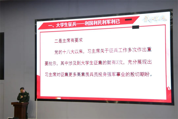 武建为同学们讲解征兵条件和优惠政策🧖🏼,解答了入伍流程、部队生活、退伍后未来发展等同学们关注的热点问题,并从家国情怀、宿州荣耀等方面鼓励有志青年报名应征。此外武建还分享了自己参军的经历🐈⬛,激发同学们献身国防的责任感和使命感,让征兵政策和国防意识深入人心🦸🏿♀️,助推我院征兵工作顺利开展。