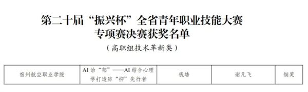 近日,安徽省第二十届“振兴杯”全省青年职业技能大赛专项赛(创新创效竞赛)落下帷幕⚗️。经过层层选拔和激烈的角逐🍼,我院学子钱皓的作品《AI治“郁”——AI结合心理学打造防“抑”先行者》荣获“铜奖”。