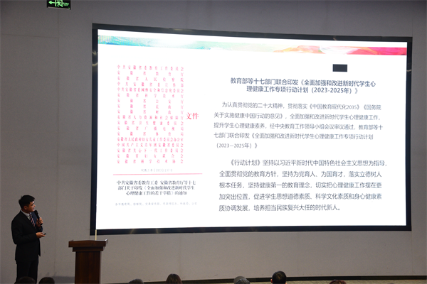 谢凡飞带领与会人员学习教育部等十七部门联合印发的《全面加强和改进新时代学生心理健康工作专项行动计划(2023-2025年)》文件,文件指出要坚持以习近平新时代中国特色社会主义思想为指导,全面贯彻党的教育方针,坚持为党育人、为国育才,落实立德树人根本任务🤛,坚持健康第一的教育理念,切实把心理健康工作摆在更加突出位置。