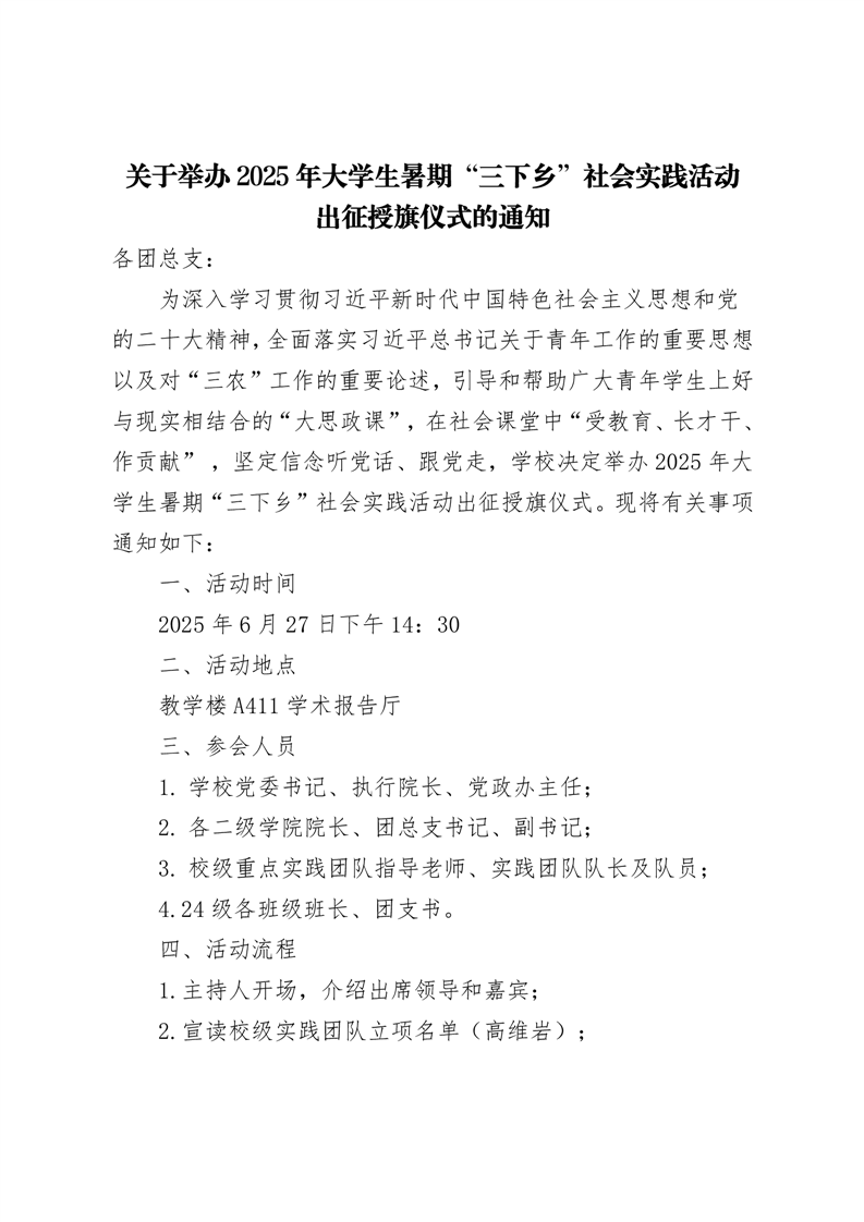 关于举办2025年大学生暑期“三下乡”社会实践活动出征授旗仪式的通知