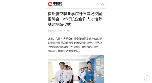双方本着“优势互补、协同育人👨🏻🦽、互利共赢”的理念,隆重举行了校企合作人才培养基地授牌仪式。乌鲁木齐航空领导对宿航的人才培养模式表示充分肯定,“非常感谢泛美和宿航为中国民航搭建了一个特别好的人才选拔平台🤽🏼♀️,为航空职业教育打造了独树一帜的标杆↖️,希望未来能够共同培养更多高质量民航人才,为更多宿航学子提供稳定的实习就业岗位。”