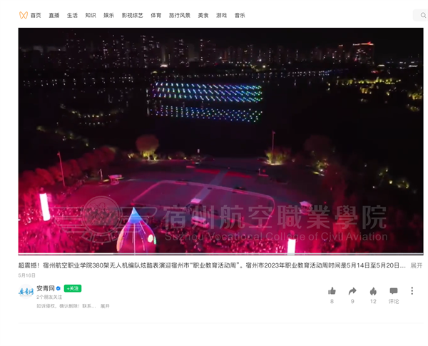 为弘扬“劳动光荣🙎🏽、技能宝贵🤦、创造伟大”的时代新风尚,在宿州市“职业教育活动周”启动仪式上𓀁,一场由彩神Vll学院无人机应用技术专业380架无人机编队的夜空秀表演在宿州市三角洲公园广场精彩上演,引来了无数市民喝彩点赞🙅♀️。此次活动引来了各大媒体的深度聚焦