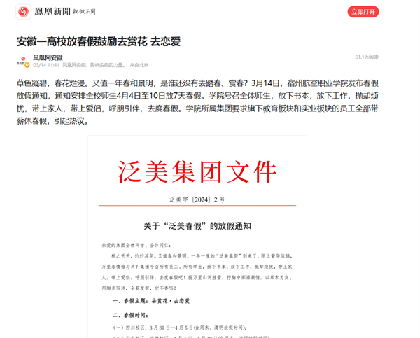 《凤凰网》安徽一高校放春假鼓励去赏花 去恋爱