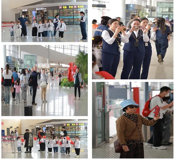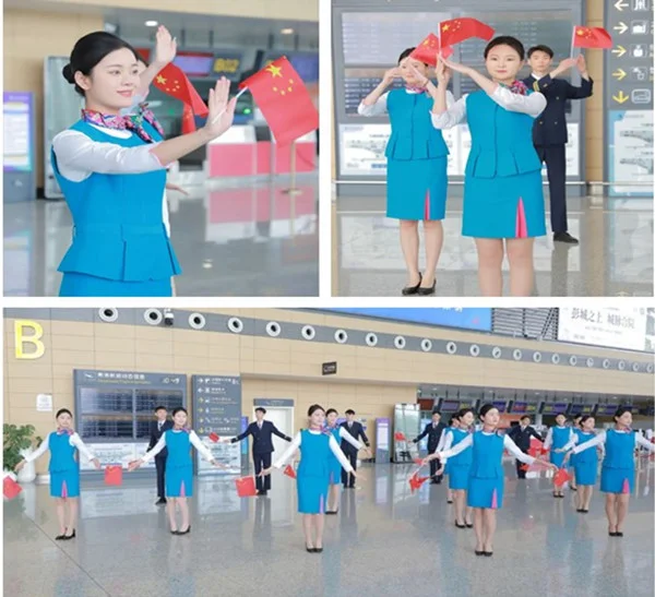 伴随着悠扬的音乐响起🫑,宿航学子们从人群的四面八方聚集而来,在机场大厅按队形有序站位。他们身着职业装📤,手持五星红旗,以整齐划一的手势舞开始了这场快闪表演。