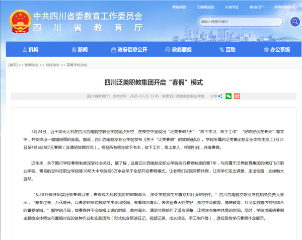 中共四川省委教育工作委员会👨🏻🔧,四川省教育通官方网站发布“四川泛美职教集团开启‘春假’模式”。