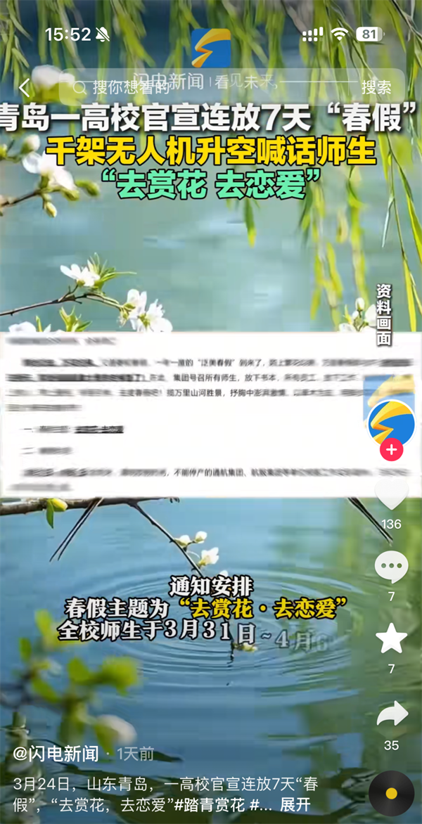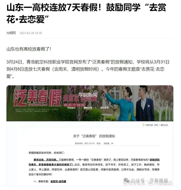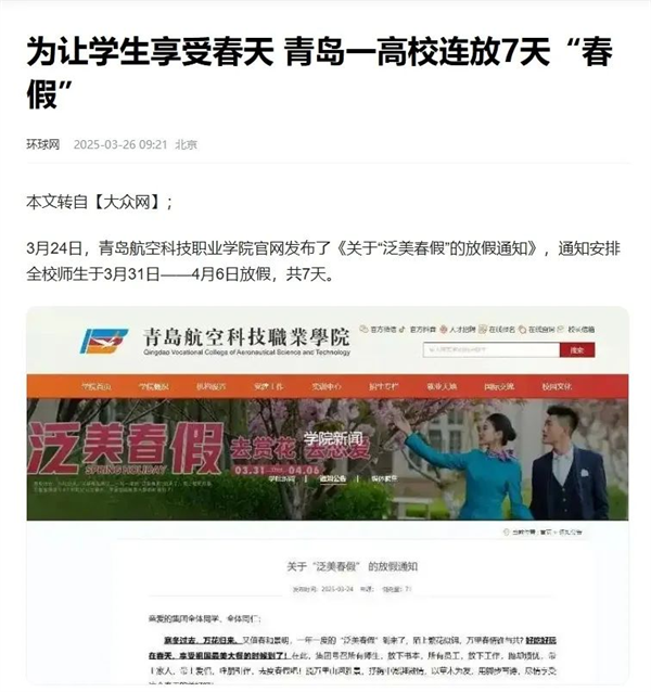 共青团山东省委官方公众账号青春山东头条转发“羡慕了!山东一高校宣布连放7天‘春假’”。