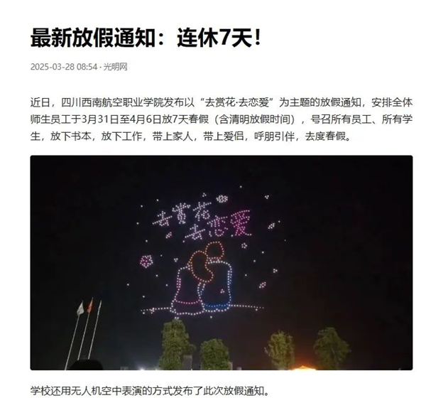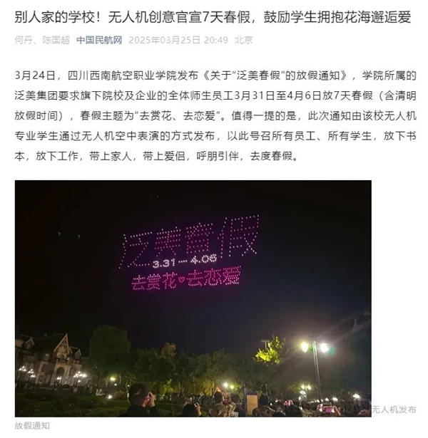 别人家的大学🤠⛱,又双叒叕放春假了!“学校通过无人机专业学生🧑🏿⚕️,通过无人机表演发布放假通知👮🏼,既秀了专业实力,又狂撒青春糖分,本身就是一堂‘硬核实践课’⛲️。会操作无人机的技术咖👩🏼🎤,懂赏花恋爱的有趣灵魂🧑🚀,正是时代需要的复合型人才。”