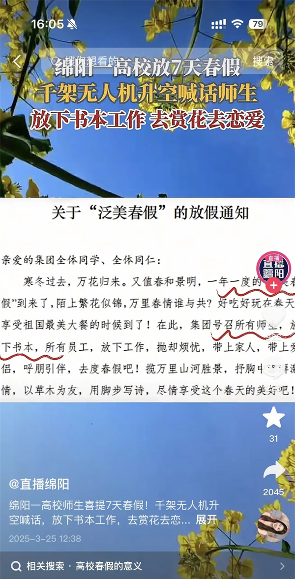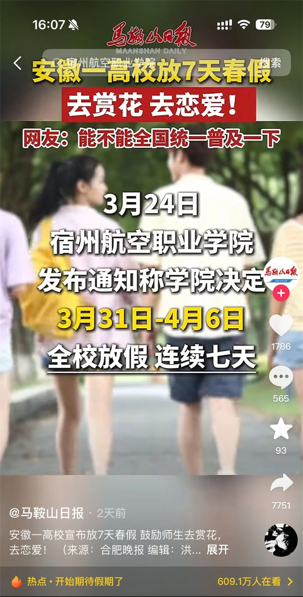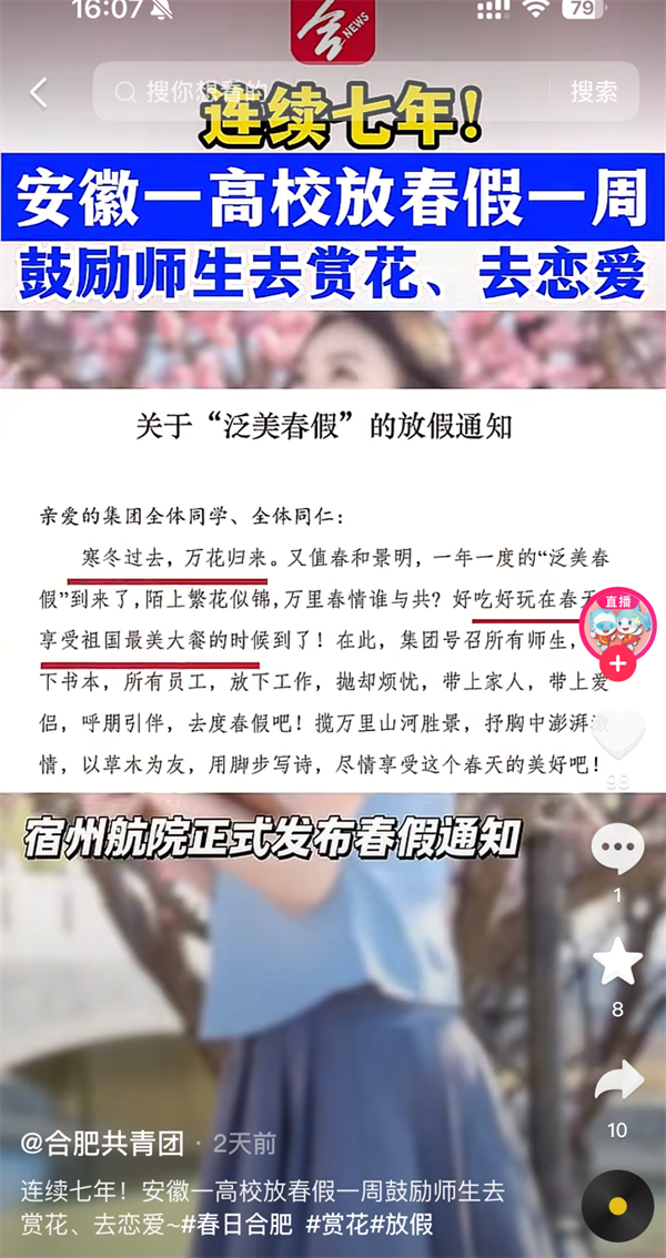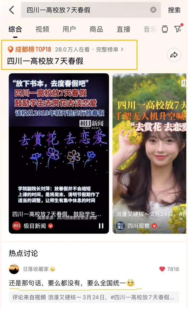 “泛美春假”“高校放7天春假鼓励赏花恋爱”的话题,持续发酵,在多个新闻客户端的头条推送、还登上了各地区抖音👨🏼🦳、微博、微信搜索等实时热度榜单……