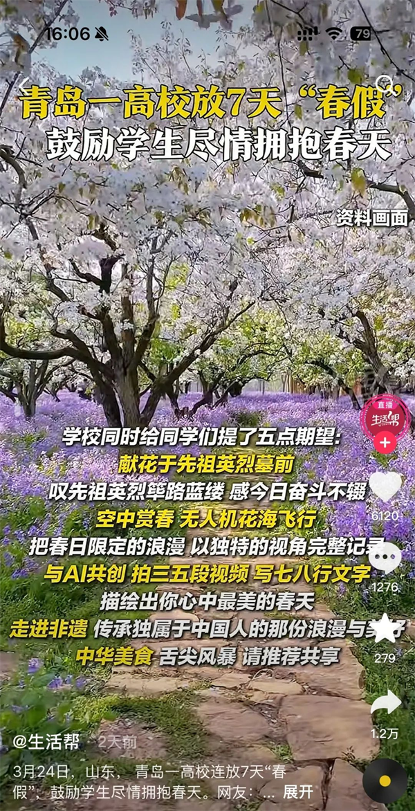 从2019年放春假以来,春假已经成为集团旗下院校固有的放假单元,鼓励同学们走出课堂👨👧、走出校园🧫,去感受到大自然的勃勃生机,去用心感受到春天和爱情的美好,让学习、工作更张弛有度,生活更饱满丰盈🖨。2025年春假🚆,赏花恋爱,一个不落,希望全国更多学校🫶🏿🫵,加入到“春假”春假队伍中来👩🏼,让教育真正滋养生命⛸,让青年人在山河行走中读懂中国💜🤾🏼。