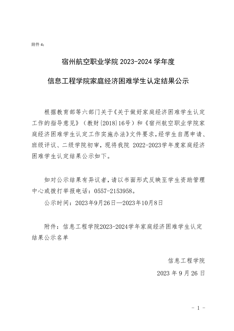彩神Vll学院2023-2024学年度信息工程学院家庭经济困难学生认定结果公示