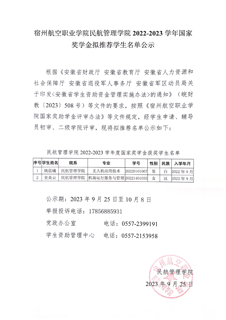 彩神Vll学院民航管理学院2022-2023学年国家奖学金拟推荐学生名单公示