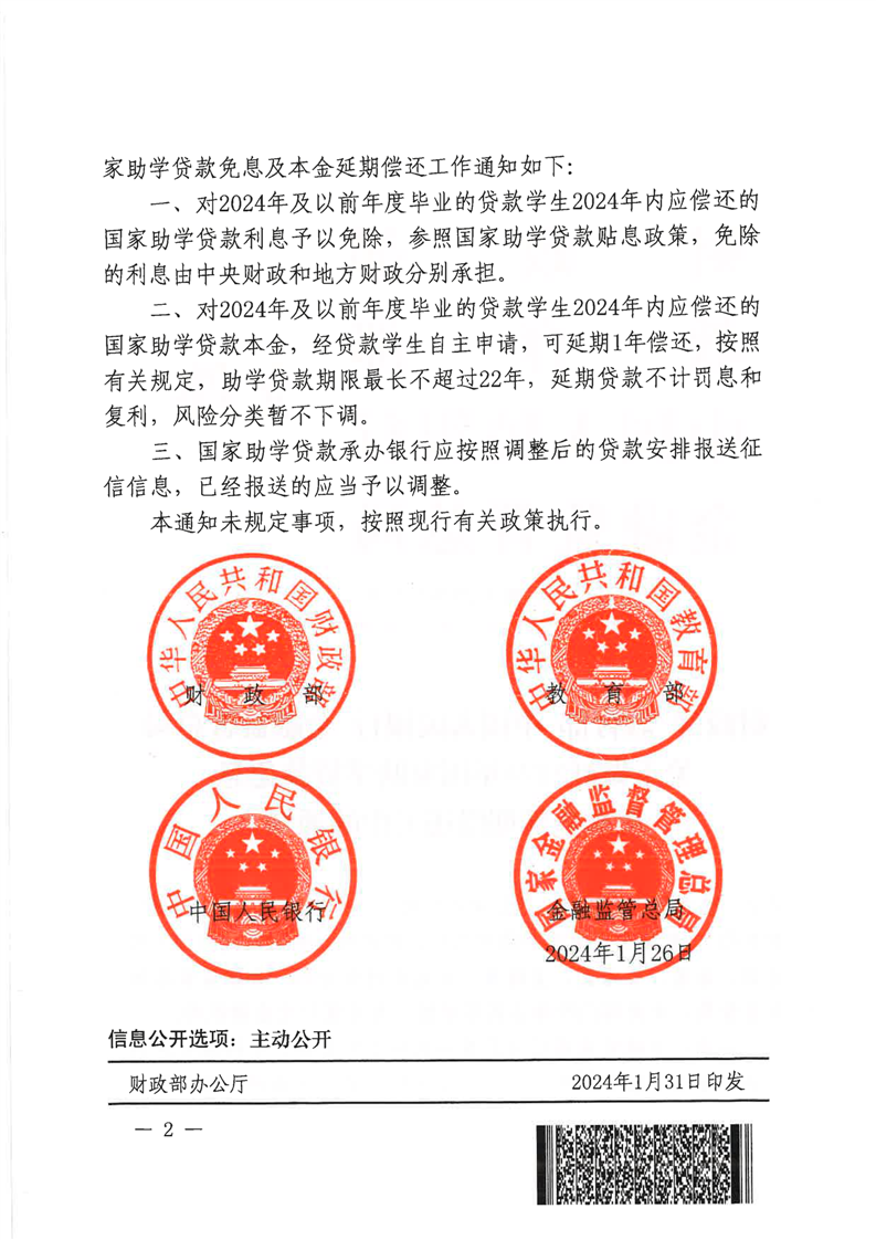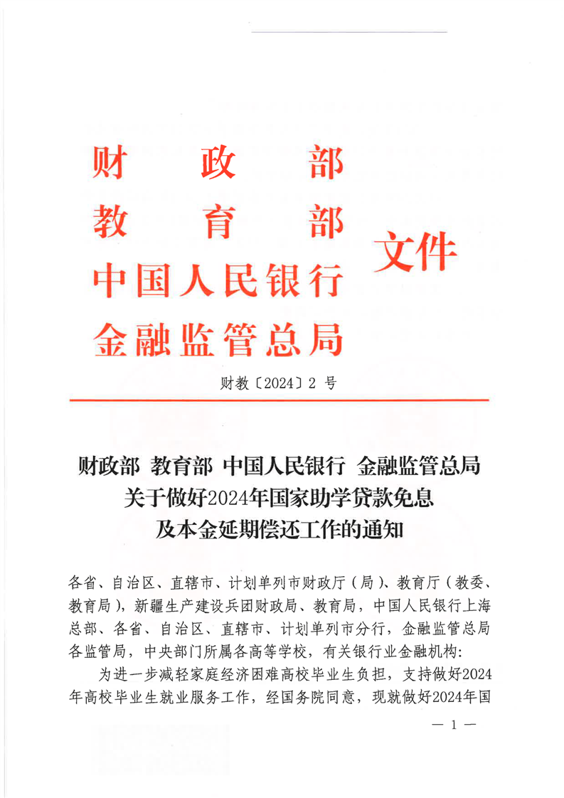 财政部 教育部 中国人民银行 金融监管总局关于做好2024年国家助学贷款免息及本金延期偿还工作的通知