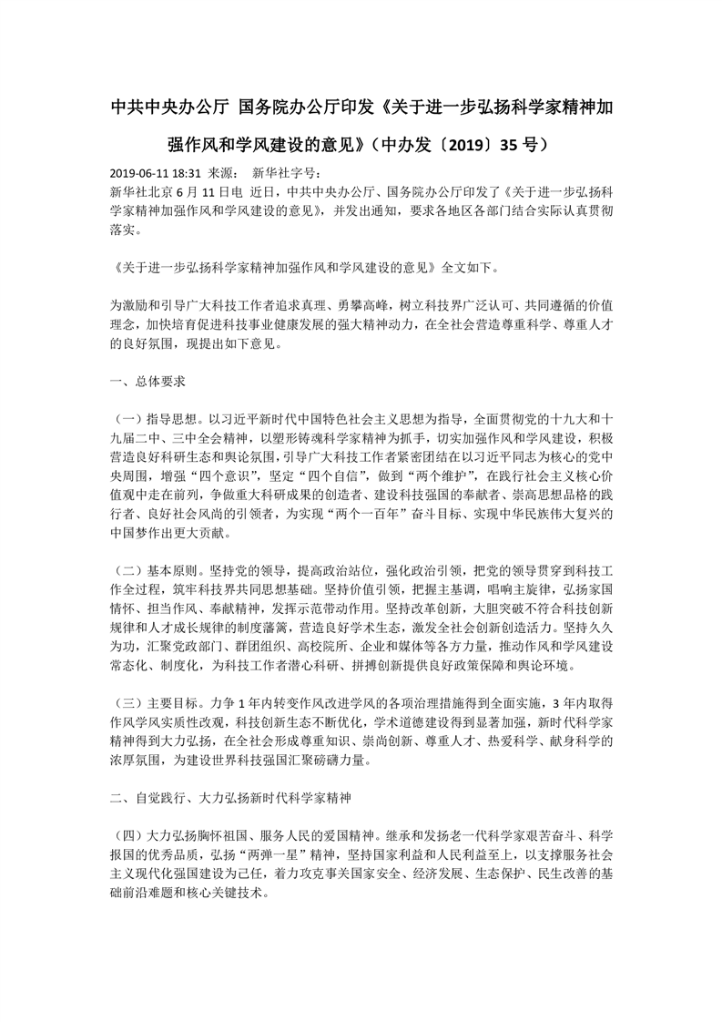 中共中央办公厅 国务院办公厅印发《关于进一步弘扬科学家精神加强作风和学风建设的意见》(中办发〔2019〕35 号)