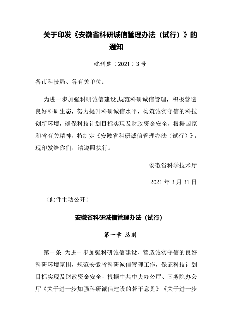 关于印发《安徽省科研诚信管理办法(试行)》的通知