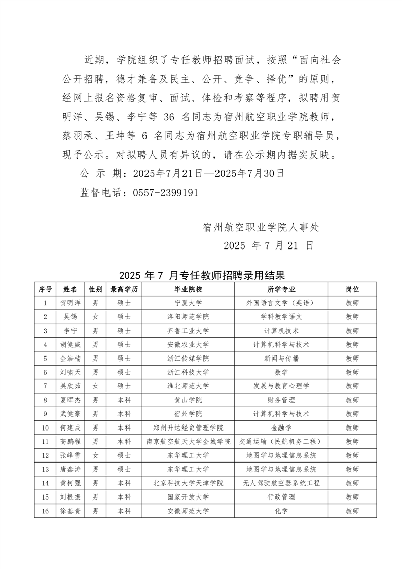 彩神Vll学院2025年7月专任教师、辅导员招聘录用公示