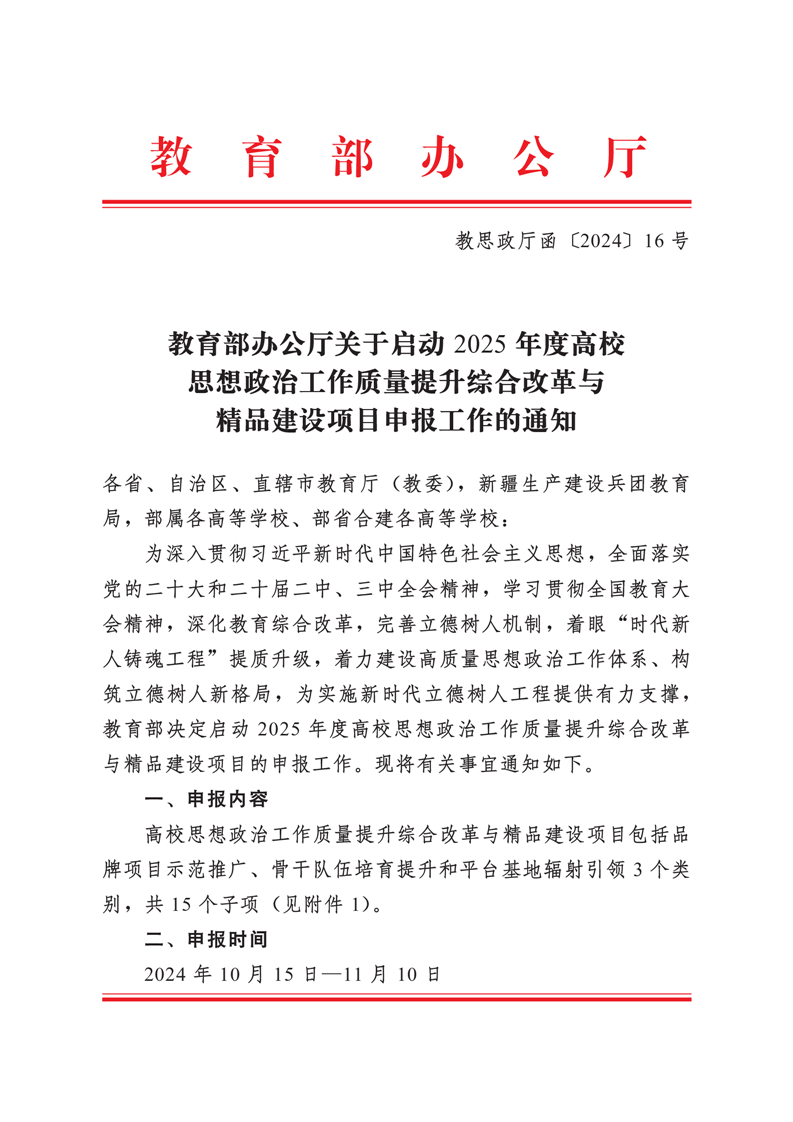 中共安徽省委教育工委转发教育部办公厅关于启动2025年度高校思想政治工作质量提升综合改革与精品建设项目申报工作的通知