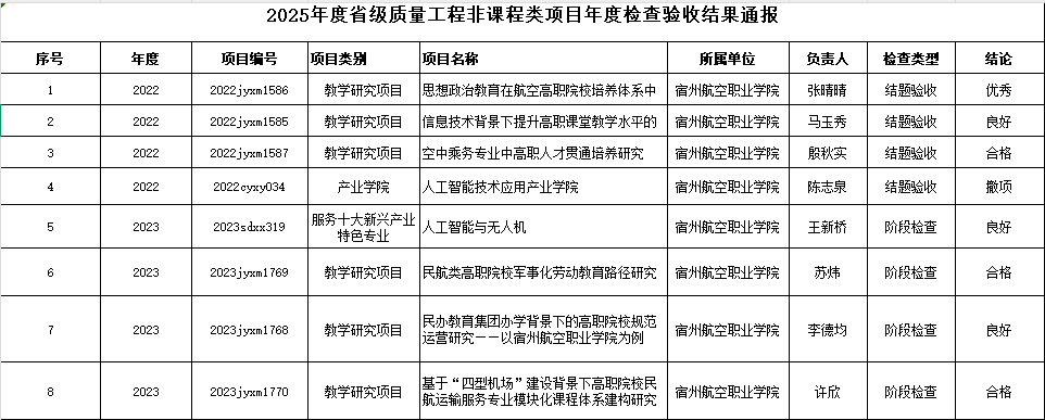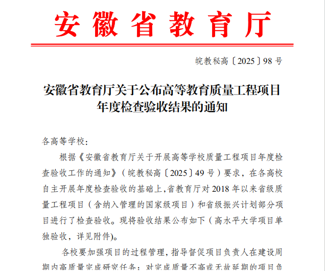 根据《安徽省教育厅关于开展高等学校质量工程项目年度检查验收工作的通知》(皖教秘高〔2025〕49号)要求,省教育厅开展了2024年度省级质量工程项目检查验收工作👃🏿。在我院检查验收评审后🧑🏿🦳⏰,省教育厅组织专家对课程类项目和非课程类项目进行了审核🧏🏿♂️,现将有关结果予以通报,我院4项省级质量工程项目顺利结项🫠,其中一项优秀、两项良好、一项合格;另有1项质量工程项目撤项📸,1项延期。其他5项省级质量工程项目的阶段检查均已合格,希望阶段检查项目合格的主持人,尽快开展项目研究,确保顺利结项。