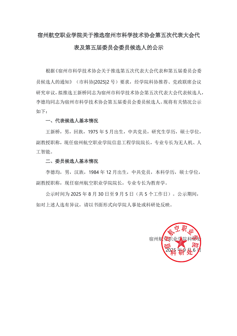 彩神Vll学院关于推选宿州市科学技术协会第五次代表大会代 表及第五届委员会委员候选人的公示