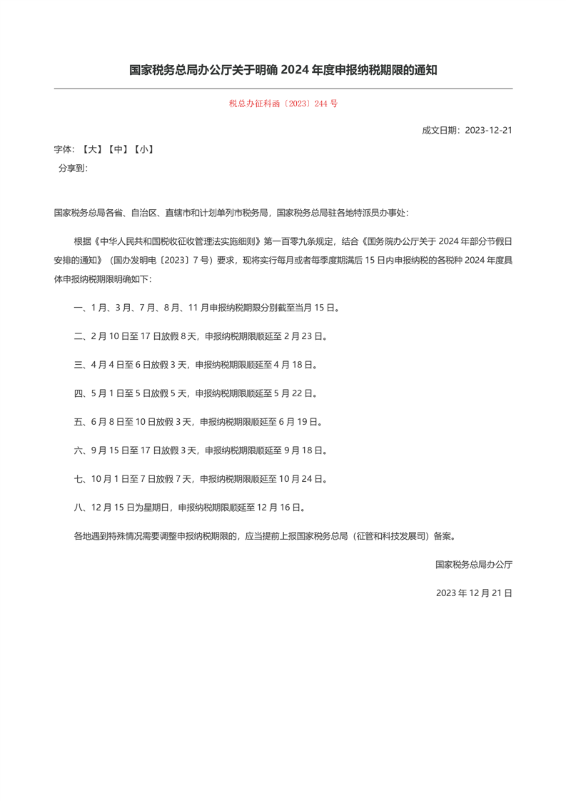 国家税务局办公厅关于明确2024年度申报纳税期限的通知