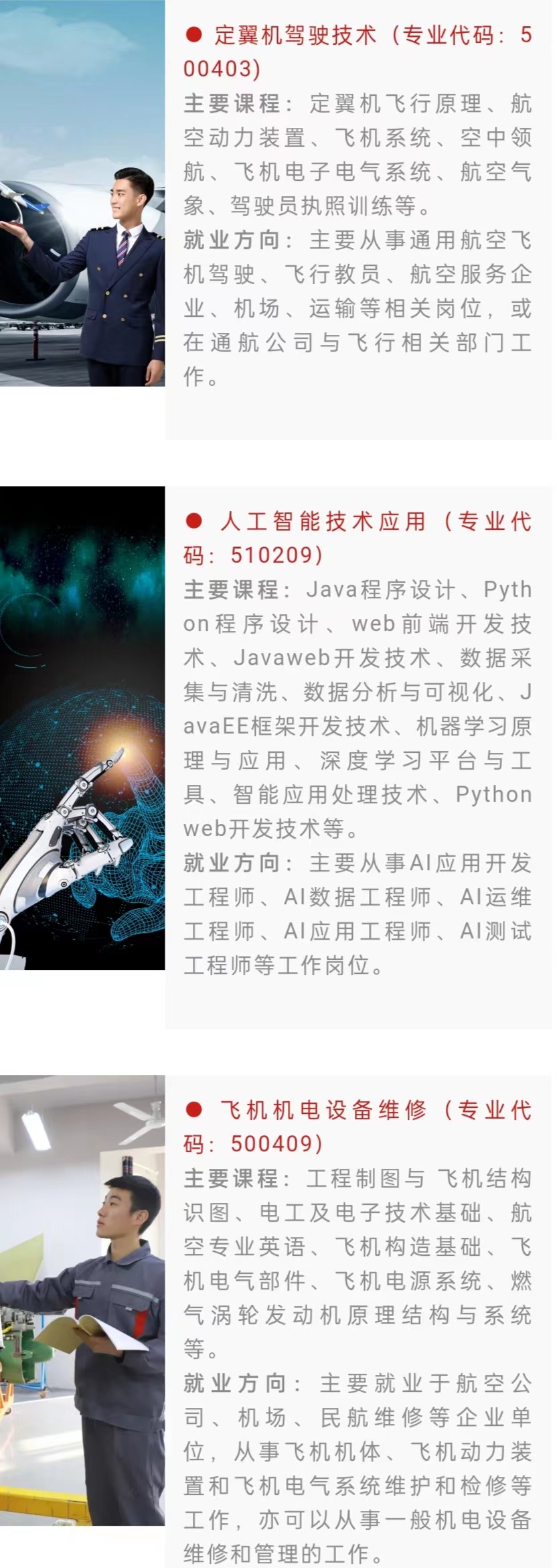 学院立足安徽、面向长三角🫴🏼、服务航空产业,培养高素质技术技能型人才🗡,开设无人机应用技术🕊、民航运输服务、定翼机驾驶技术、空中乘务、民航安全技术管理、飞机机电设备维修🥩、机场运行服务与管理、人工智能技术应用、网络营销与直播电商9个专业👩🏻‍🌾。
