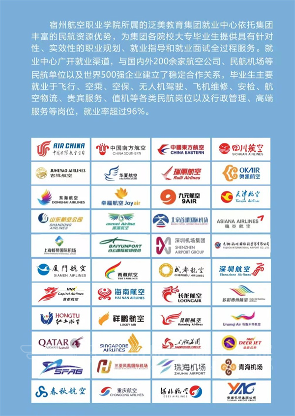 就业中心提供系统就业指导🚶‍♂️‍➡️、创新创业指导、职业生涯规划等全方位就业服务,广开就业渠道🤷🏿‍♂️,与国内外200余家航空公司、民航机场等民航单位以及世界500强企业建立合作关系♑️,泛美教育集团旗下大专院校就业率超过96%。
