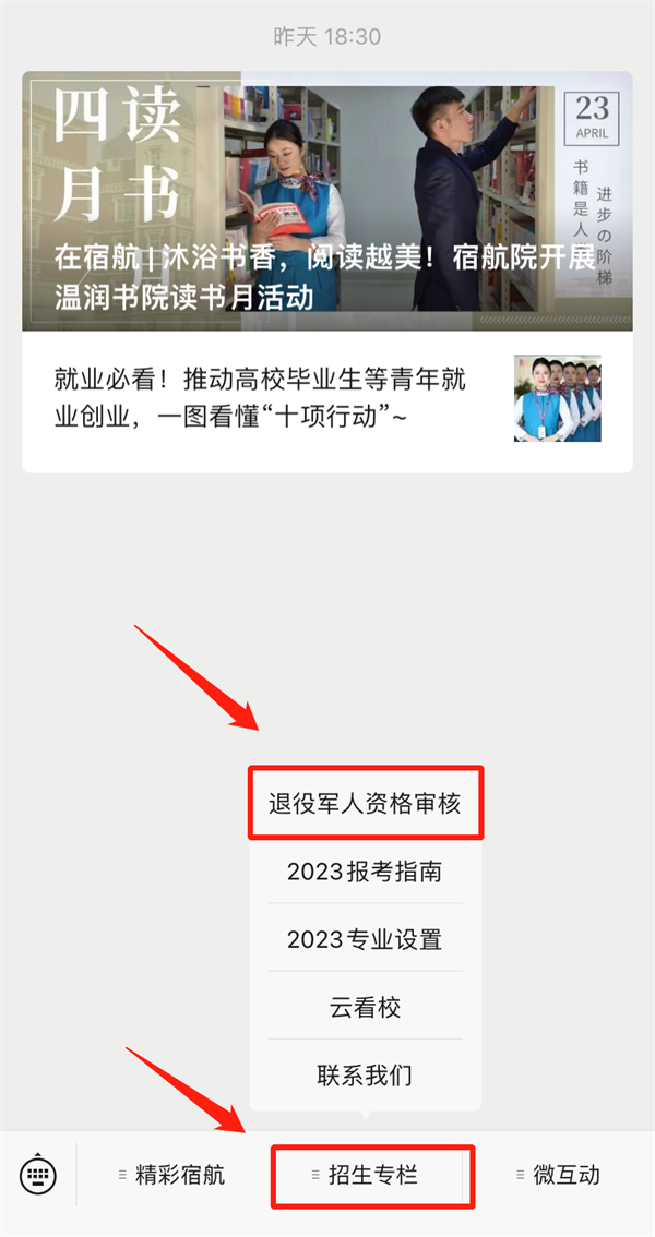 2.进入公众号后点击“招生专栏”,点击上方“退役军人资格审核”;