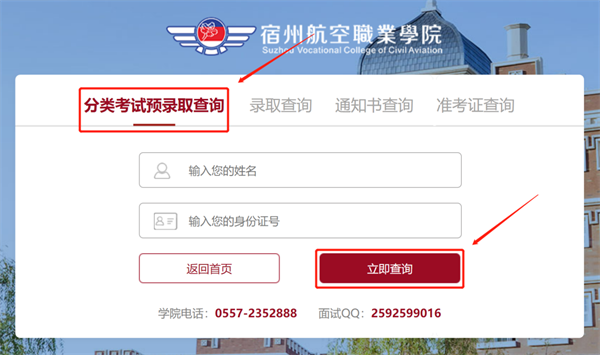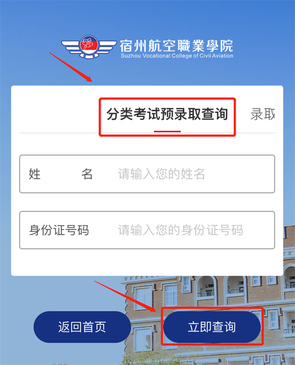 2.进入后点击“分类考试预录取查询”,根据提示填写学生“姓名”及“身份证号码”🧑🏿🔧,填写正确后,点击下方“立即查询”🛌🏻♨️;