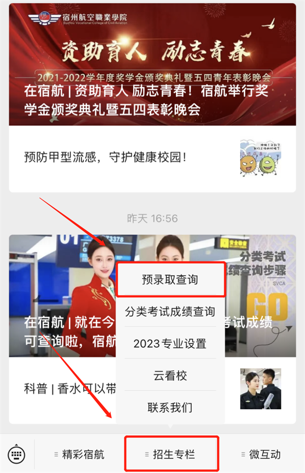 2.进入公众号后点击下方“招生专栏”,之后点击上方“预录取查询”🚙,进入查询页面;