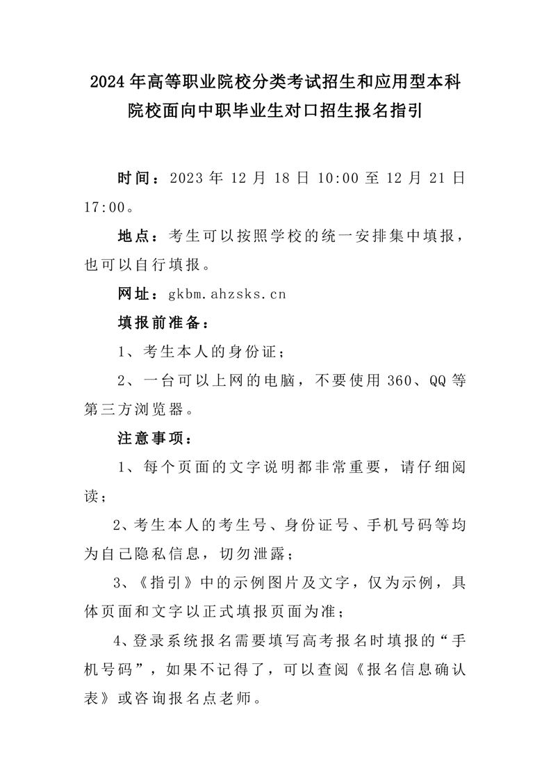 安徽省2024年高等职业院校分类考试招生和应用型本科高校面向中职毕业生对口招生报名和考试公告