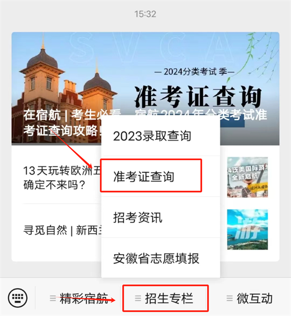 2.进入公众号后点击下方“招生专栏”💼,之后点击上方“准考证查询”,进入查询页面;