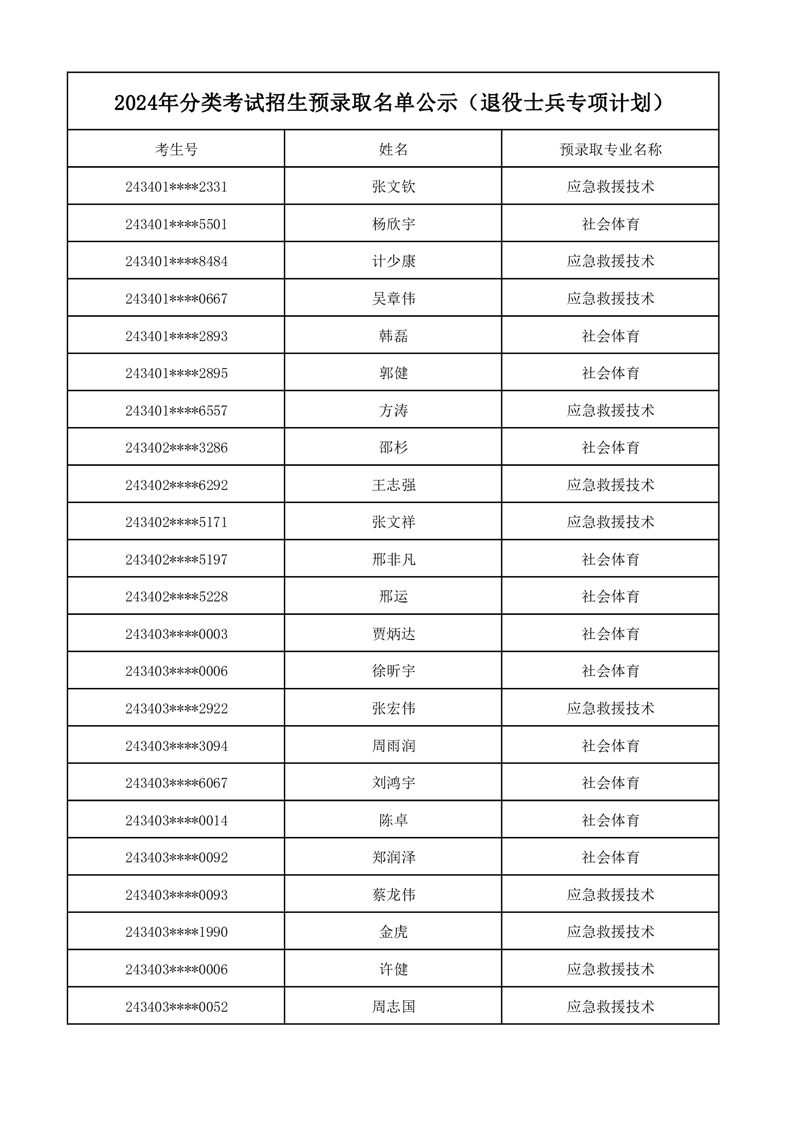 彩神Vll学院2024年分类考试招生预录取名单公示(退役士兵专项计划)