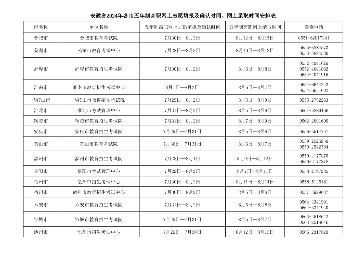 安徽省2024年各市五年制高职晚上填报志愿及确认时间、晚上录取时间安排表