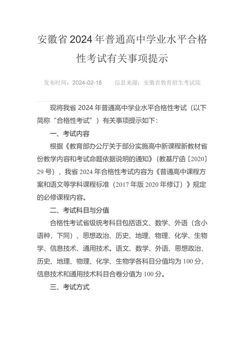 安徽省2024年普通高中学业水平合格性考试有关事项提示