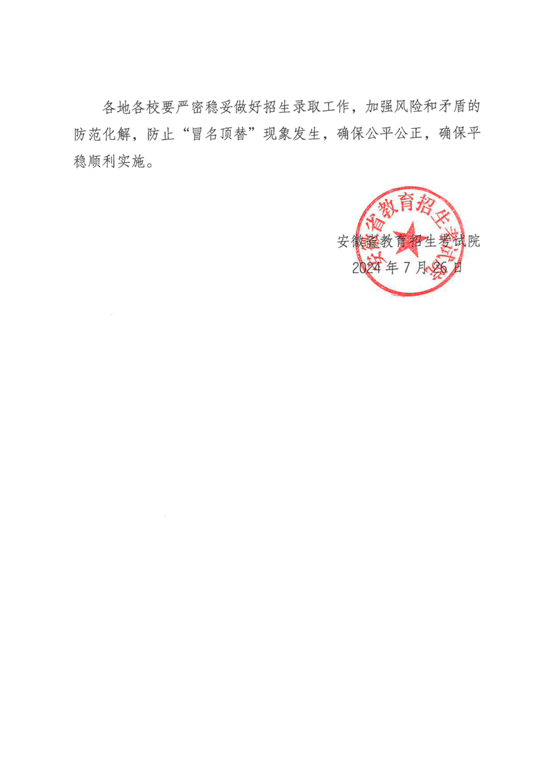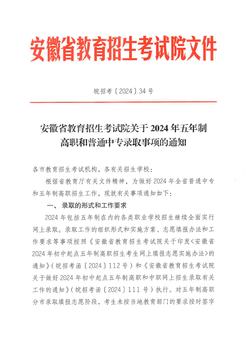 安徽省教育招生考试院关于2024年五年制高职和普通中专录取事项的通知